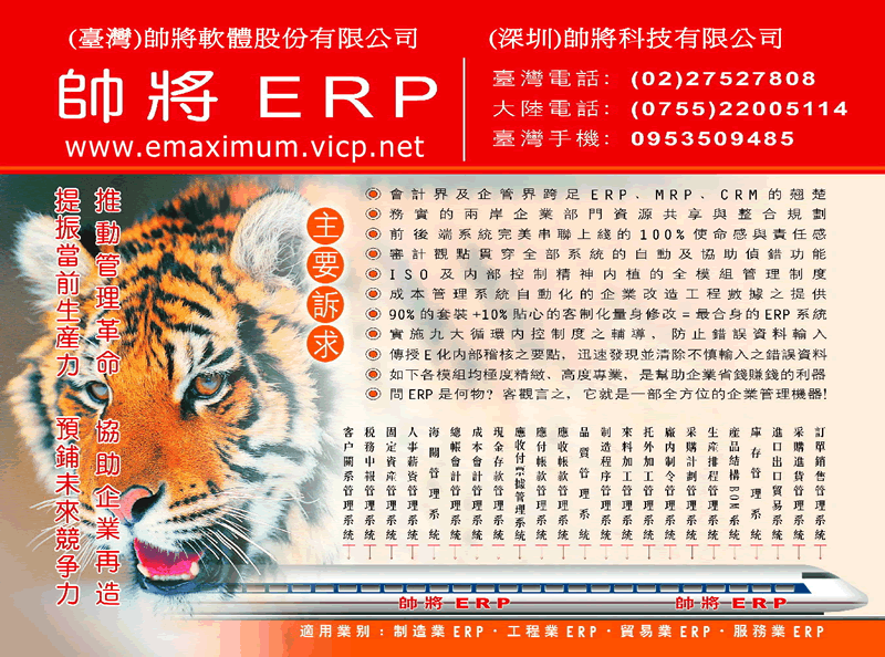 關於產品定位,本公司所開發的ERP系統為同類產品的中大型ERP系統,適合中型及大型企業使用,其中的MRP材料需求規劃系統、MPS與APS生產規劃與排程系統、MRP-II製造資源規劃系統、SFC制程管理系統、財務管理系統、成本管理系統,為目前同業中的頂級產品。